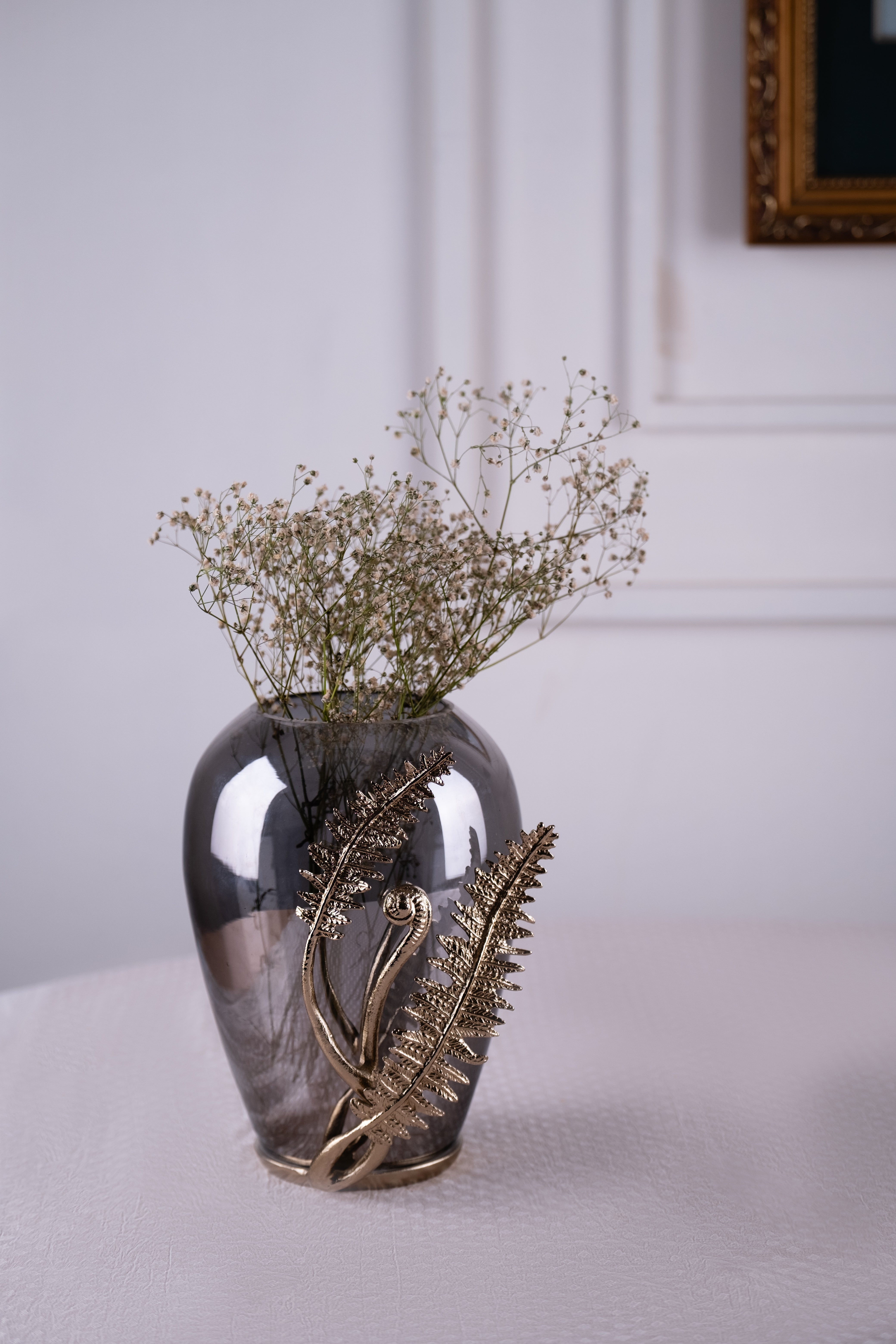 Striking the perfect balance between bold form and delicate detail, the Zenith Vase by Invoke Home and Living is a true showstopper. Featuring a smoky metallic glass body adorned with a sculptural fern motif in a luxe gold finish, this vase is designed to elevate any space it graces.